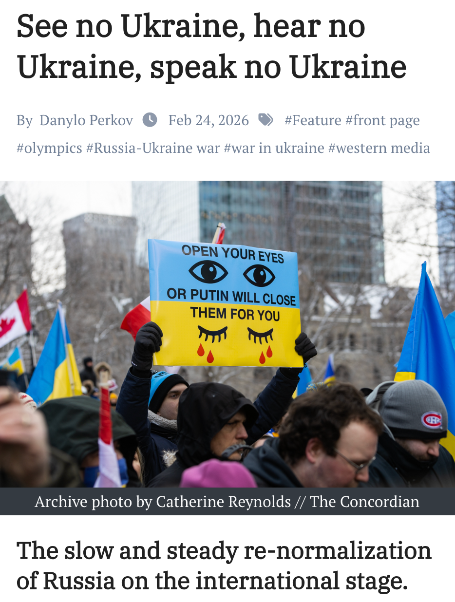 "Now, with the invasion of Ukraine taking a backseat in most Western news coverage, Russia is pushing its way back into media and international events such as the Olympics, attempting to normalize its presence and culture on the international stage...Probably the most controversial instance during the last year was the “documentary” film Russians at War." Danylo Perkov, The Concordian